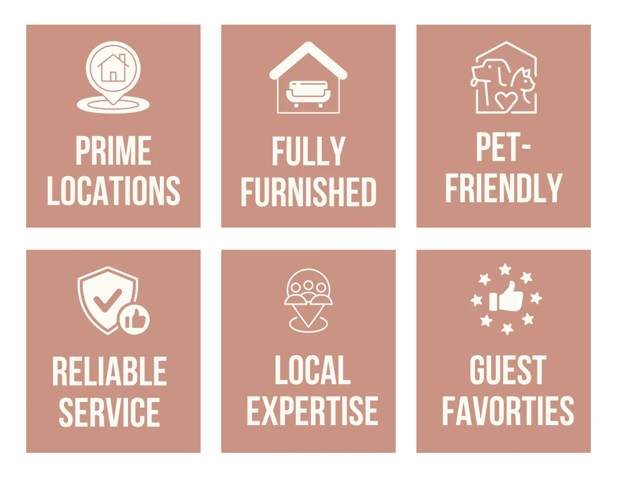 Our properties are locally owned and managed, not run by a faceless corporation. That means every detail, from the furniture we choose to the way we communicate with you, is rooted in care and personal attention. With consistent 5-star reviews and loyal repeat guests, we’ve built a reputation for delivering clean, well-designed, and reliable homes in some of the most sought-after neighborhoods.